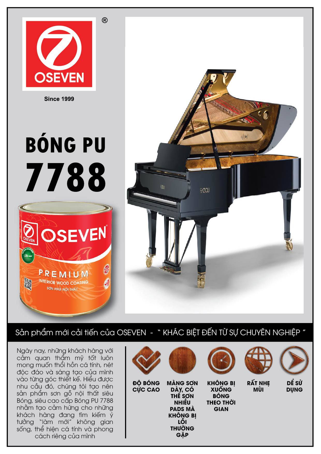 Vừa qua, công ty CP Oseven đã cho ra mắt sản phẩm mới mang tên Bóng PU 7788, đây là sản phẩm cải tiến của dòng sơn bóng Oseven dựa trên cảm hứng thổi hồn vào sản phẩm gỗ nghệ thuật những nét thẩm mỹ và cá tính riêng.