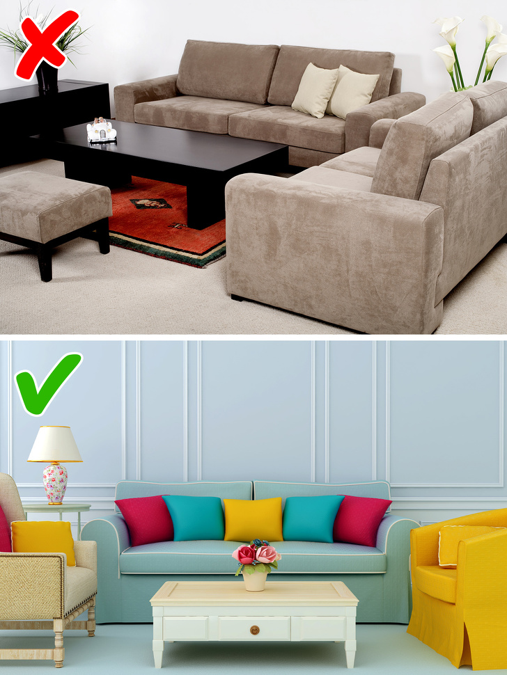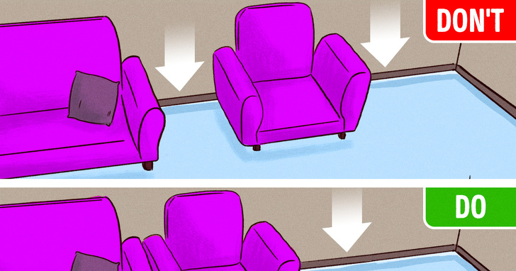 Có quá nhiều khe hở tường sẽ gây khó khăn cho việc sử dụng không gian tường, làm căn phòng trở nên xấu xí lại kém chức năng. Thay vào đó, các chuyên gia đề nghị đặt các mảnh đồ nội thất gần nhau hơn.